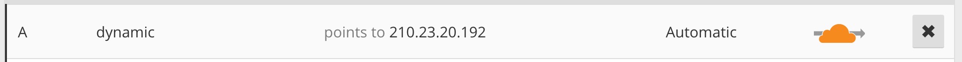 On the Cloudflare side, I created an A record, which pointed the desired URL (dynamic.chinpen.net) to the the local IP address. This record would then get automatically updated by ddclient when it sees the local IP address changing.